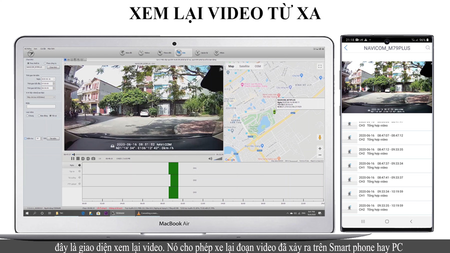- Với camera hành trình gương cao cấp Navicom M79Plus bạn có thể xem lại đoạn video quan trọng ngay trên smart phone và máy tính mà không cần phải đến tận nơi đặt thiết bị để kết nối với wifi do thiết bị phát ra (cũng không cần phải tháo thẻ nhớ ra). Dù xe của bạn ở bất cứ nơi đâu chỉ cần có kết nối 3G/4G là bạn có thể xem lại được video từ xa.