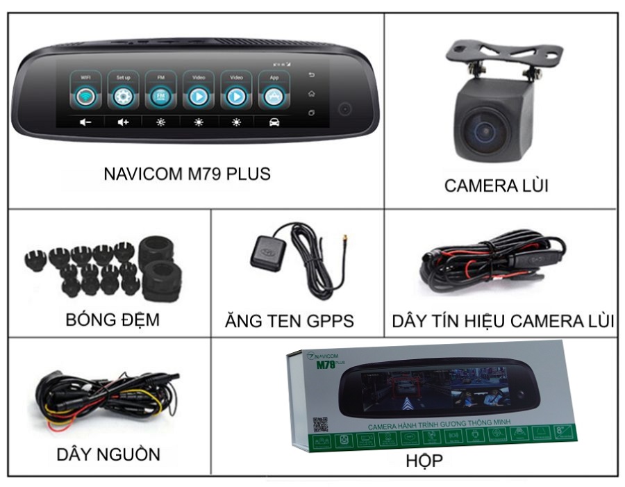 - Trọn bộ camera hành trình dạng gương cao cấp Navicom M79 Plus bao gồm: